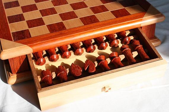 This chessboard and chess set is make from padauk and beech. The board has a 1mm wide separator of maple between the squares. The playing squares are 40mm in size and the overall size of the board is 410mm x410mm x 100mm high.The drawer bodies are made from mahogany. The finish is wax polished.