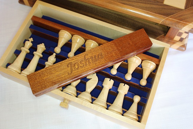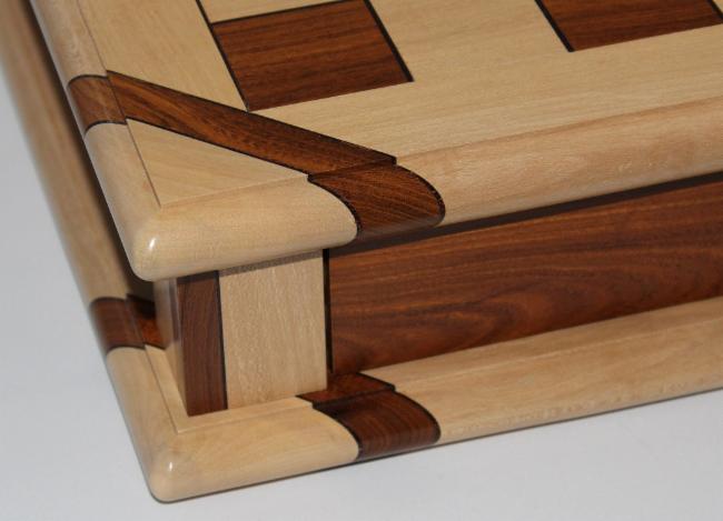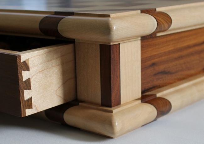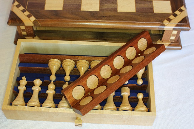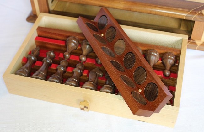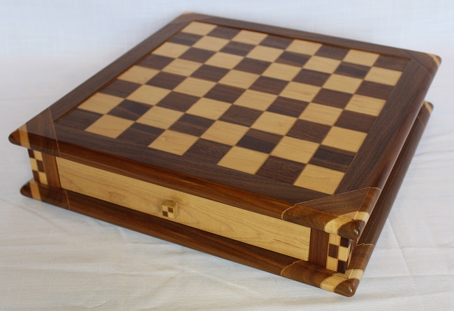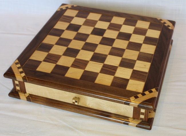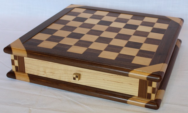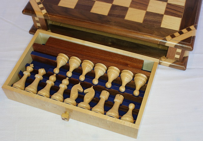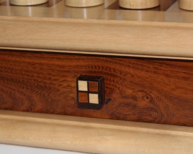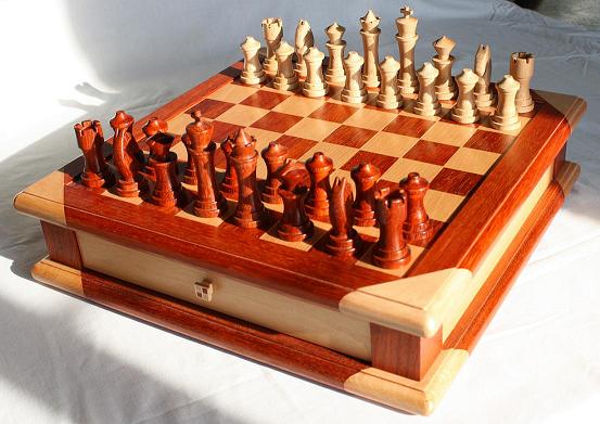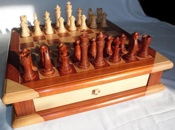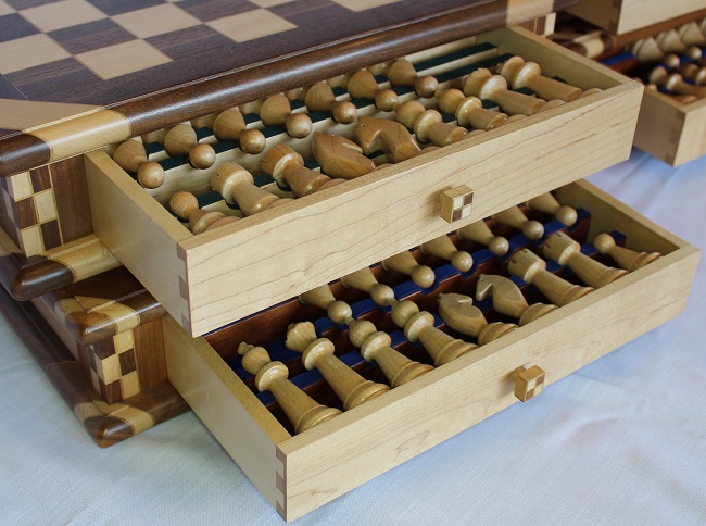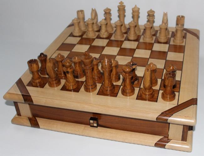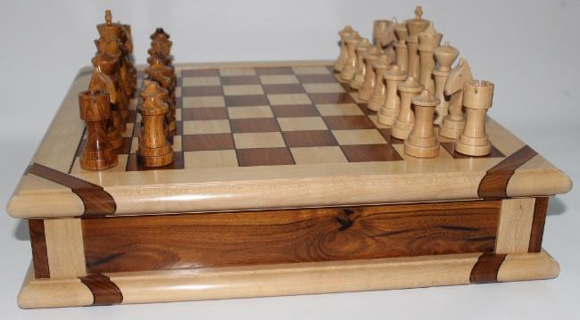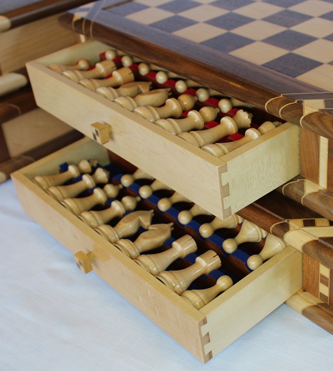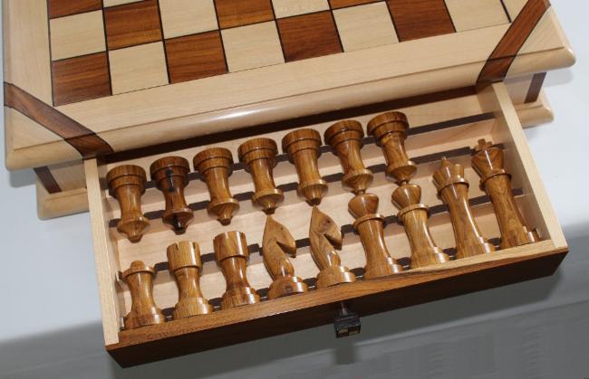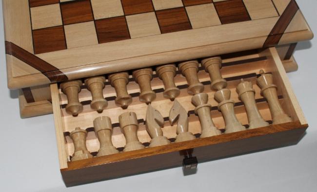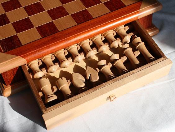The chessboard shown below is made from laburnum and holly with a wenge separator in the joints. The playing squares are 40mm in size and the overall size of the board is 410mm x410mm x 100mm high.The drawer bodies are made from maple. The pieces have a base of 30mm diameter and the height varies between a pawn at 50mm up to the king at 90mm. The finish is sealed and wax polished.