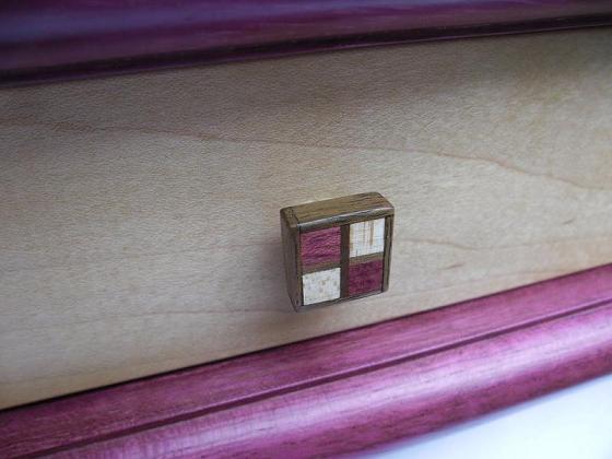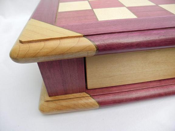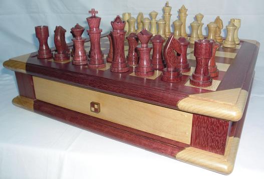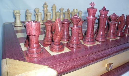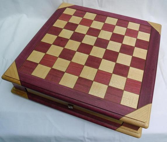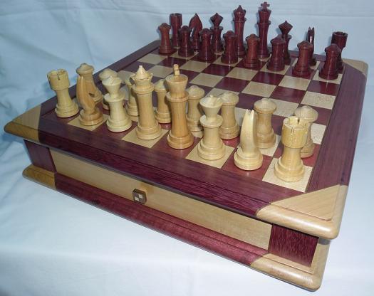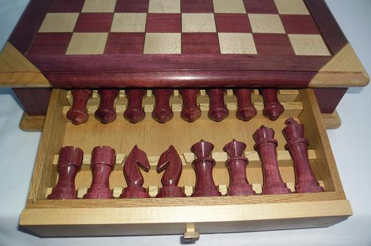 The chessboard shown below is made from purpleheart and maple with a walnut separator in the joints. The playing squares are 40mm in size and the overall size of the board is 410mm x410mm x 100mm high.The drawer bodies are made from oak. The pieces have a base of 30mm diameter and the height varies between a pawn at 50mm up to the king at 90mm. The finish is sealed and wax polished.