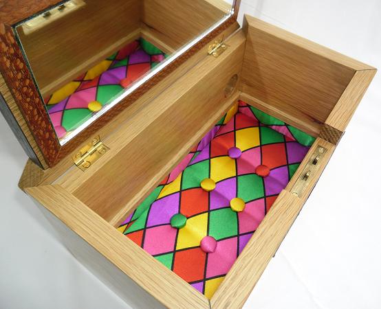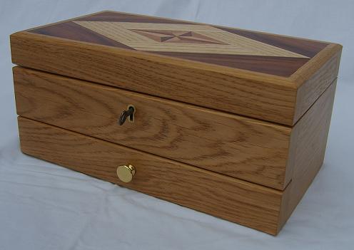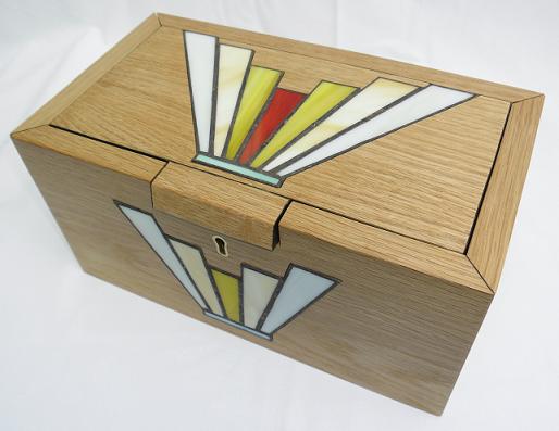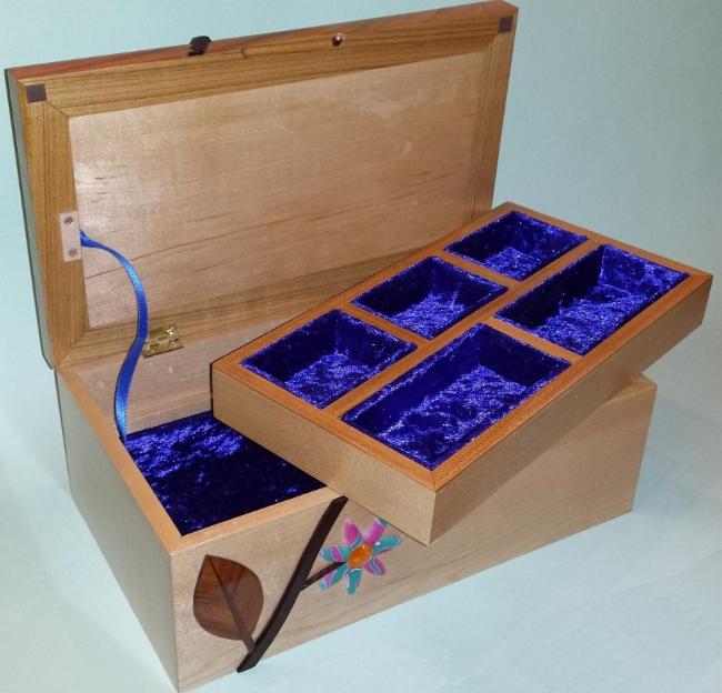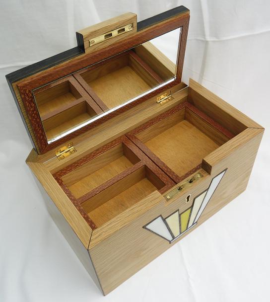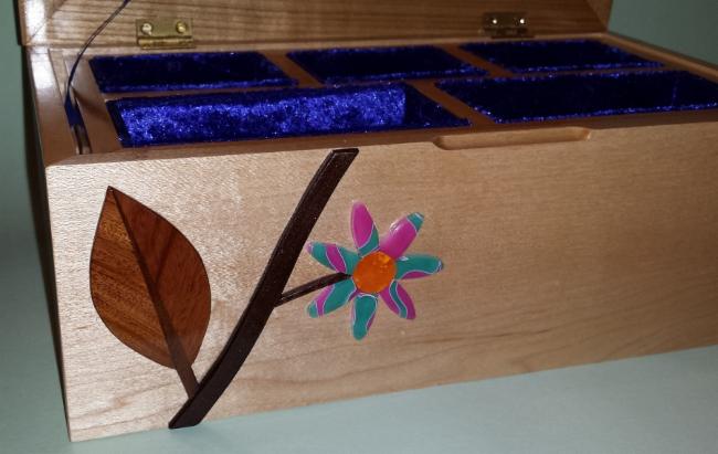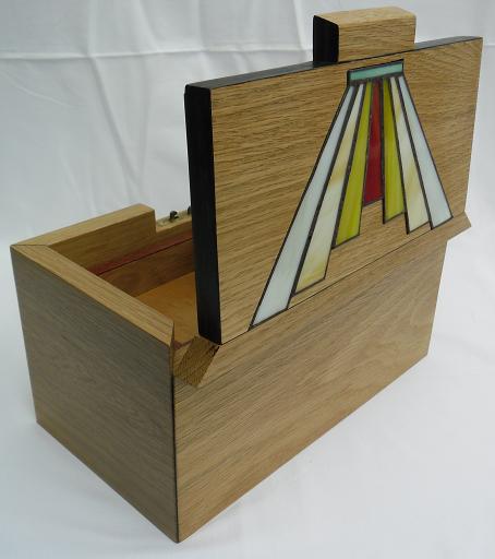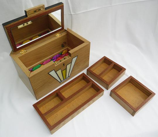 box below is primarily made from oak. The joints and edge of the lid are lined with zebrano veneer. The inlaid panels are made from hand blown stained glass. The tops of the lift out trays are lined with ropala lacewood.
