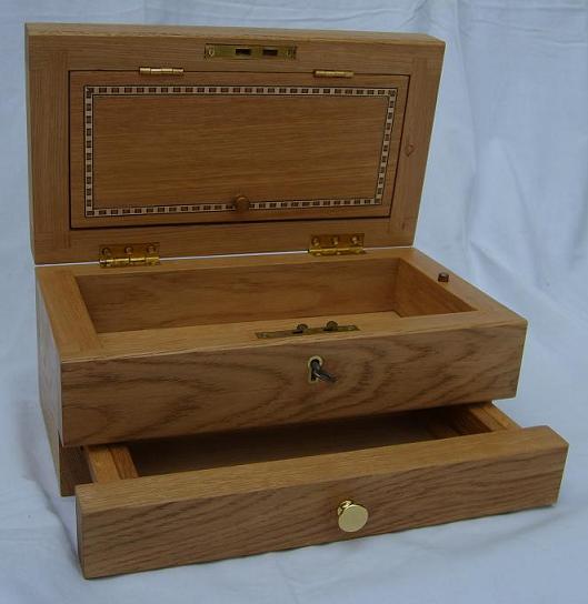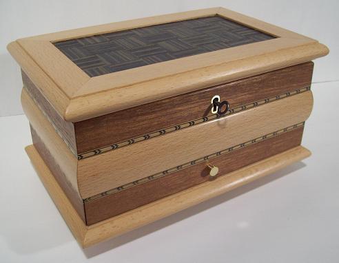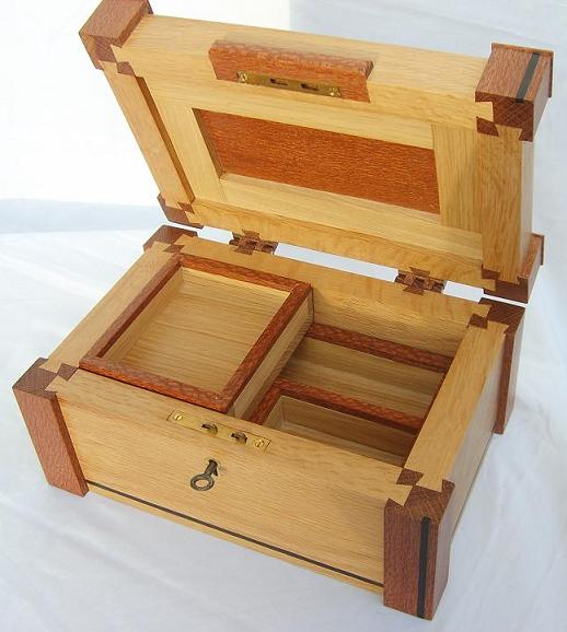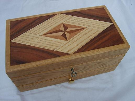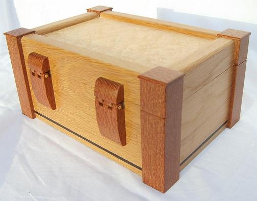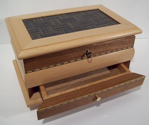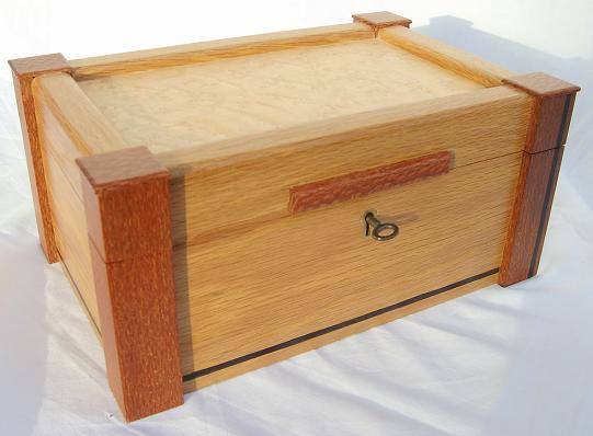 below is made from oak and ropala lacewood. The panel in the top is birdseye maple veneer.