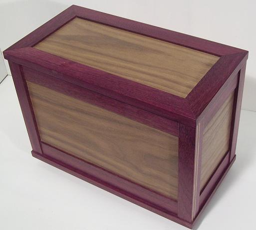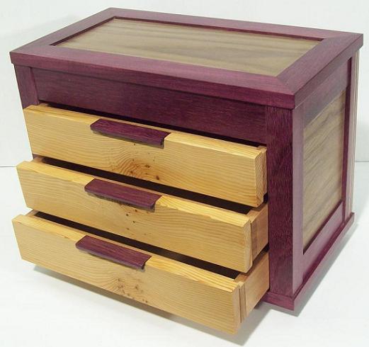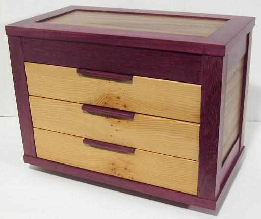 Features: 3 lift out trays plus padded, lined and buttoned bottom compartment together with a mirror inside the lid.The box below is made from purpleheart and has mahogany drawers with yew front panels and purpleheart handles. The panels on the sides, top and back are walnut veneer.