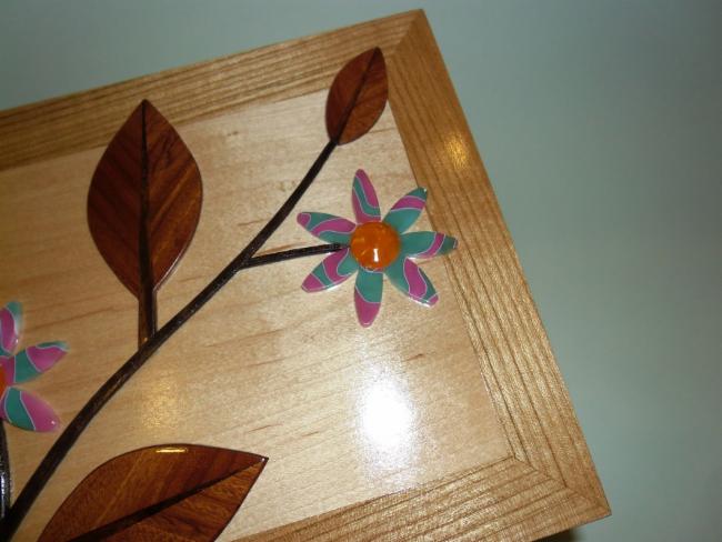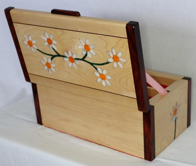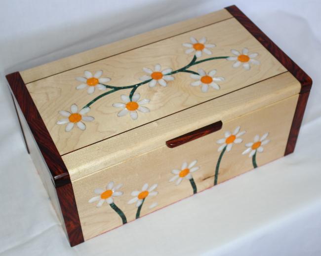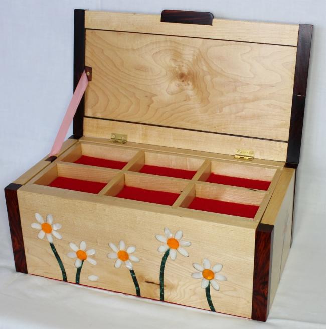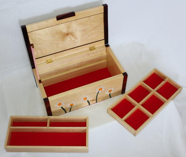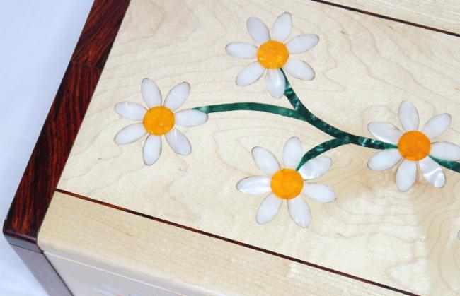 Features: Daisy flowers made from acrylic sheet, each petal and element is individually hand cut and inlaid into the maple. It also features 2 lift out jewellery trays with a full sized compartment at the bottom of the box, sealed and waxed to finish.