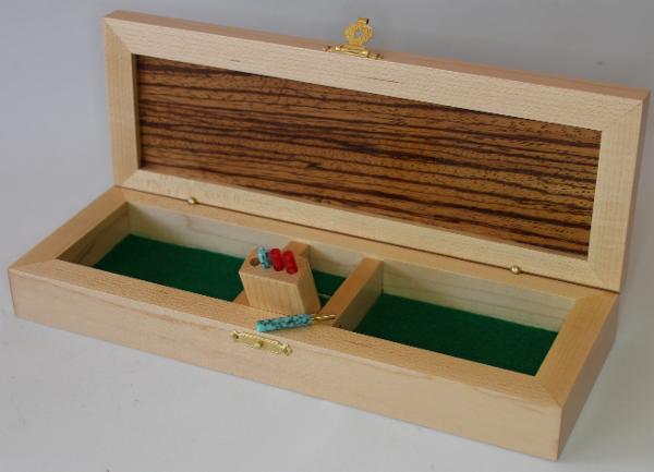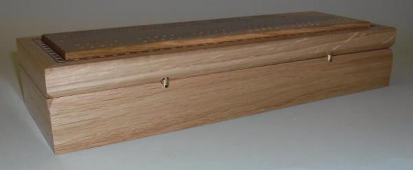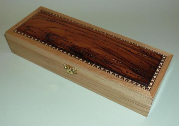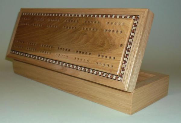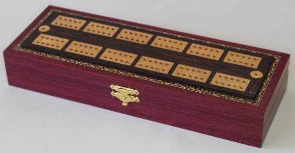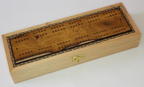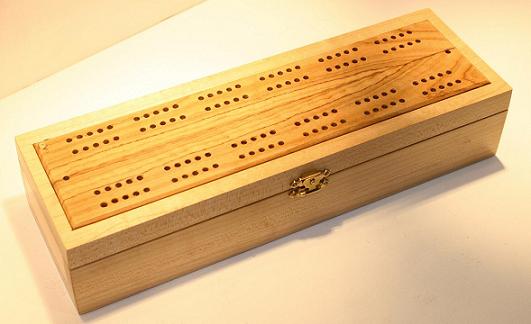 Shown below is an Athena Cribbage Board made from Maple with a Wild Olive top playing surface.