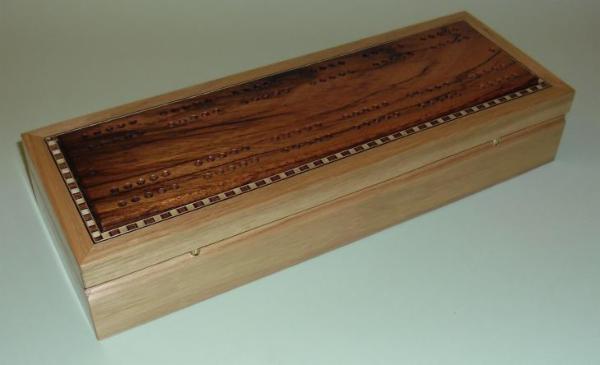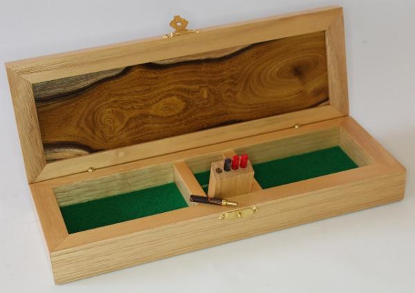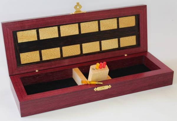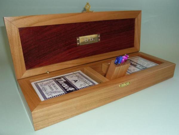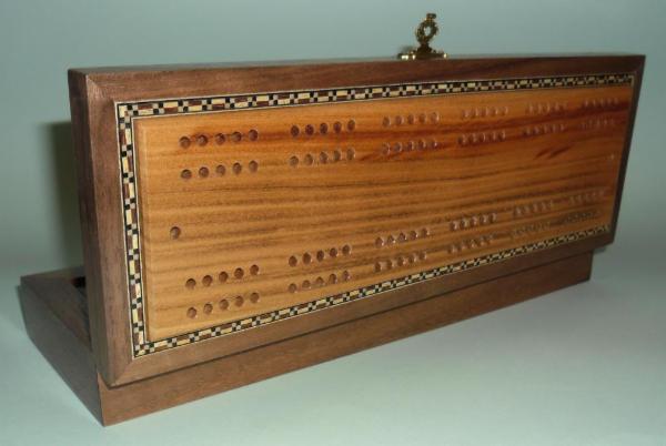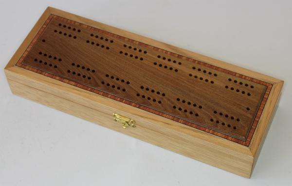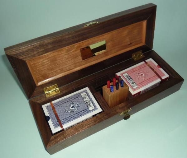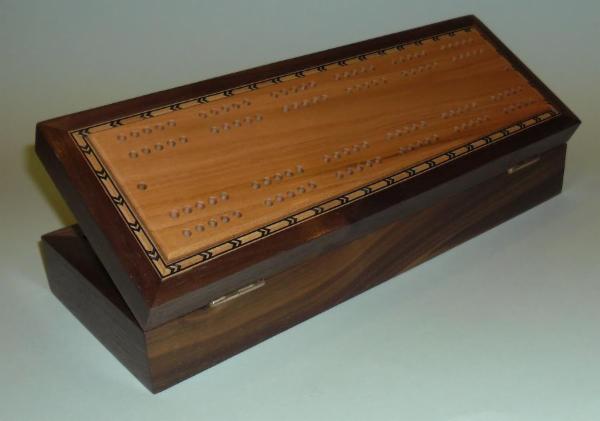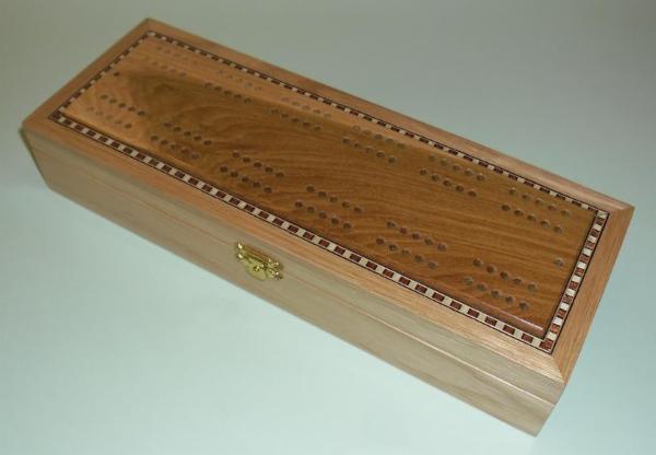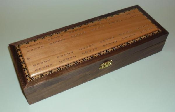 Shown below is an Athena Cribbage Board made from American Black Walnut with a Cherry playing surface and features an engraved plaque on the inside of the lid.