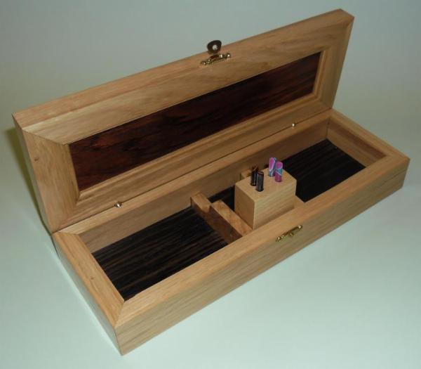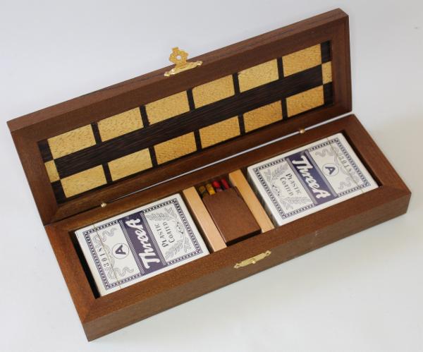 Generally the body or box is made from one wood and the playing surface on top is made from a contrasting wood. The board is finished with 2 coats of sealer, followed by 2 coats of antique wax which is then buffed.